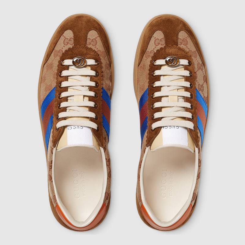 * 스니커즈. 1970년대 레트로 스타일의 농구화에서 영감을 받은 디자인. 독창적인 소재의 조합. 새로운 브릭 레드 & 베이지 컬러의 조합으로 재해석된 오리지널 GG 캔버스. 캔버스 컬러와 대조를 이루는 브라운 스웨이드 트리밍 장식과 다양한 컬러의 가죽 디테일. 측면에 클래식한 웹(Web) 디테일을 변경하여 강렬한 색조의 블루와 오렌지 컬러로 완성한 빈티지한 느낌의 나일론 스트라이프 장식. 앞면의 레이스를 돋보이게 하는 구찌 핸드백에 장식된 디테일과 동일한 타원형 에나멜 디테일 더블 G 장식.